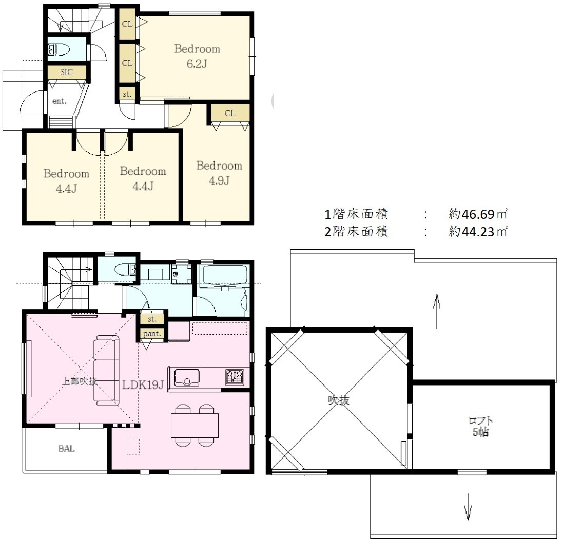 | 間取 | 2SLDK (LDK19.0帖、S6.2帖、S4.9帖、洋室4.4帖、洋室4.4帖) | ||